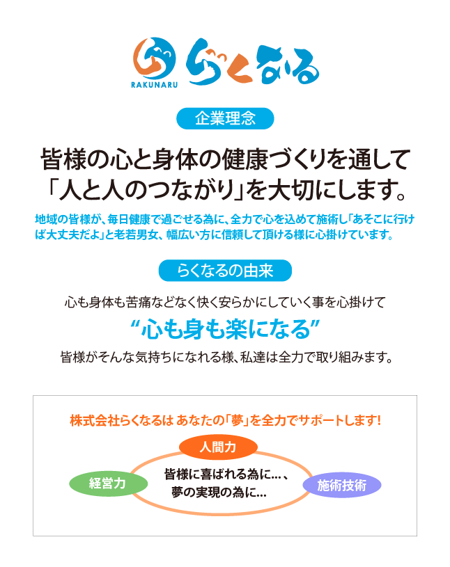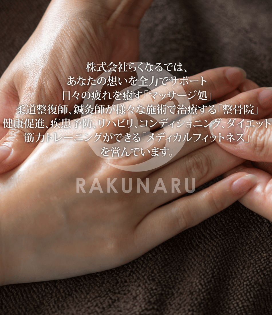 鹿児島のらくなる整骨院、リラクゼーションマッサージ店では、日々の疲れを癒すマッサージ処。柔道整復師や鍼灸師など様々な施術で治療する整骨院を営んでいます。鹿児島の方々のお体が少しでも楽になっていただけるよう最大限の努力をしているグループです。鹿児島の桜ヶ丘、西伊敷、坂之上、加世田、天文館いづろ通りで展開しています。肩こり、片頭痛、目の疲れがございましたらお気軽にご来店ください。